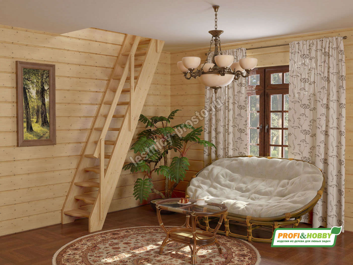 Ступени и поручень лестницы изготовлены из бука, остальные элементы из сосны.