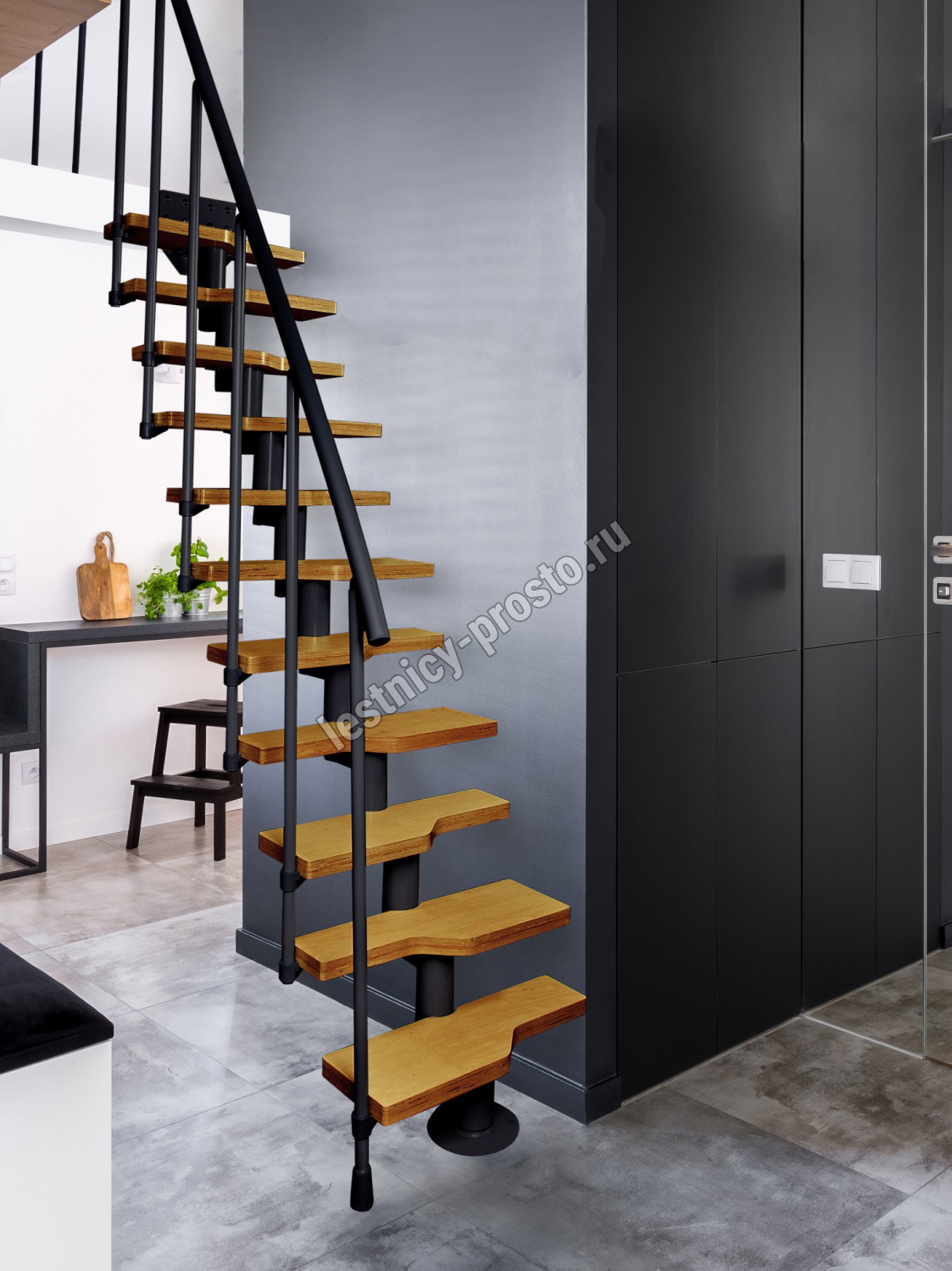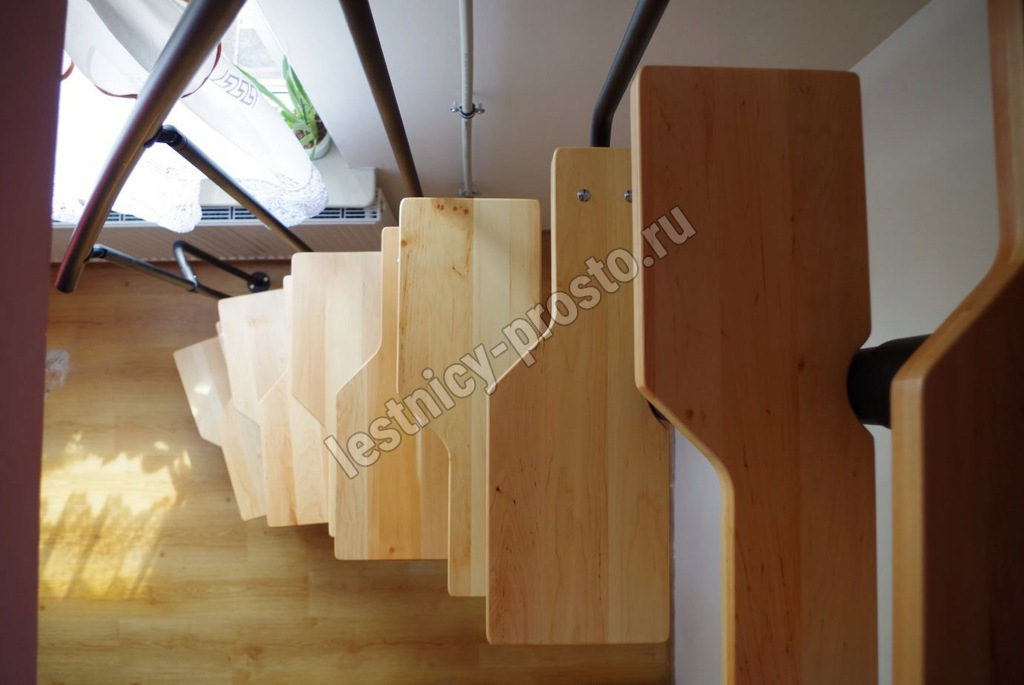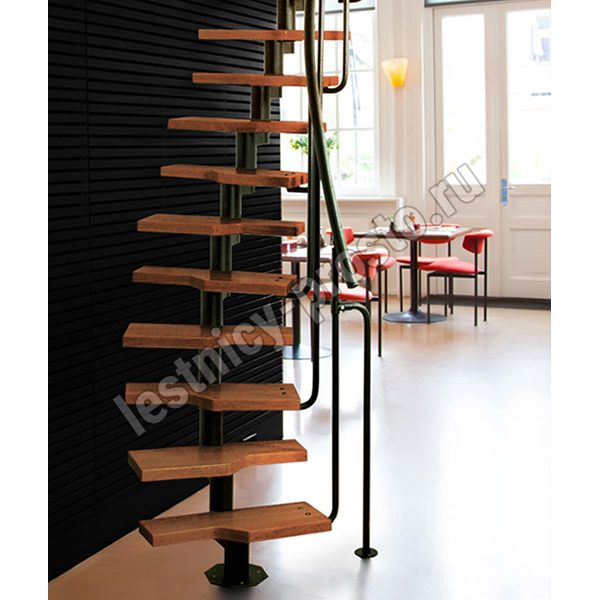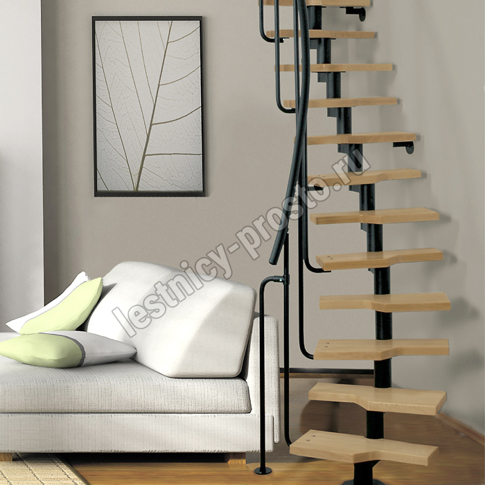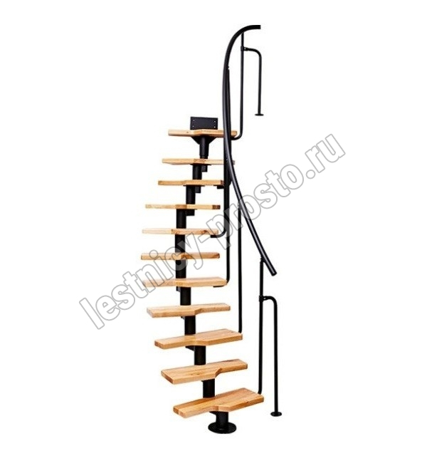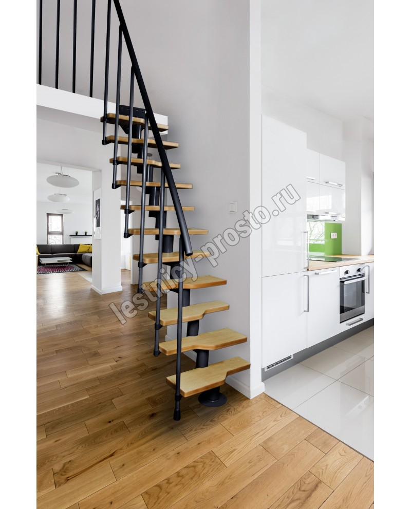 При монтаже этой лестницы, возможно регулировать высоту и глубину шага, таким образом можно получить лестницу под высоты этажа в диапазоне 2220 - 3000 мм. Ступени лестницы выполнены из сращенной ольхи и покрыты бесцветным защитным лаком. С помощью дополнительных секций (ступень + стальной модуль + фрагмент ограждения) можно увеличить высоту базовой модели до 3750 мм. Модульная конструкция лестницы позволяет собрать форму, которая наилучшим образом подходит под параметры вашего помещения. Возможны варианты прямой сборки, L-форма, U-форма.