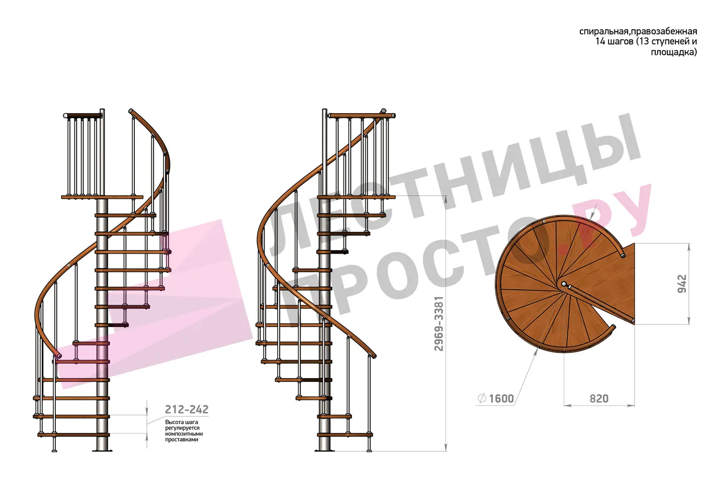 Высота ступеней регулируется с шагом 3 мм. в пределах 212-242 мм., благодаря чему, лестница прекрасно подгоняется под необходимую высоту.