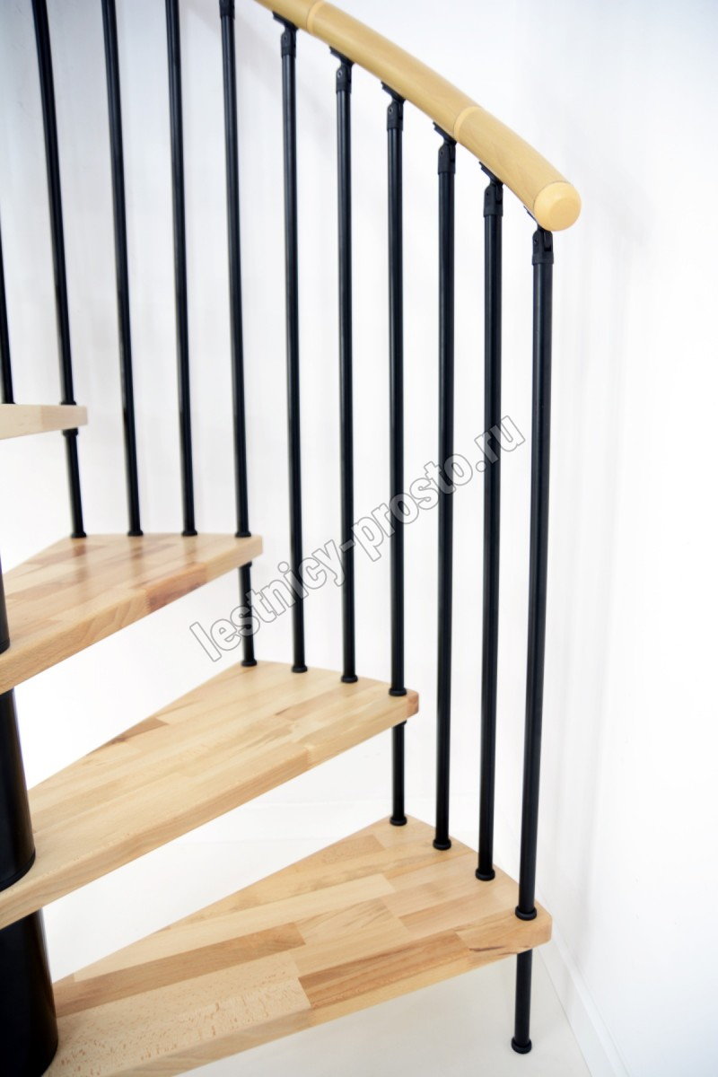 Лестница представлена в двух вариантах: с поворотом направо и с поворотом налево. Благодаря возможности регулировать высоту шага с помощью пластиковых вставок (входят в базовый комплект), высоту лестницы можно варьировать в пределах от 2860 до 3090 мм. Кроме того, купив дополнительную секцию для этой лестницы, можно поднять высоту до 3320 мм. Поручень изготовлен из массива бука в тон ступеням. Ступени и поручень покрыты износостойким защитным лаком.