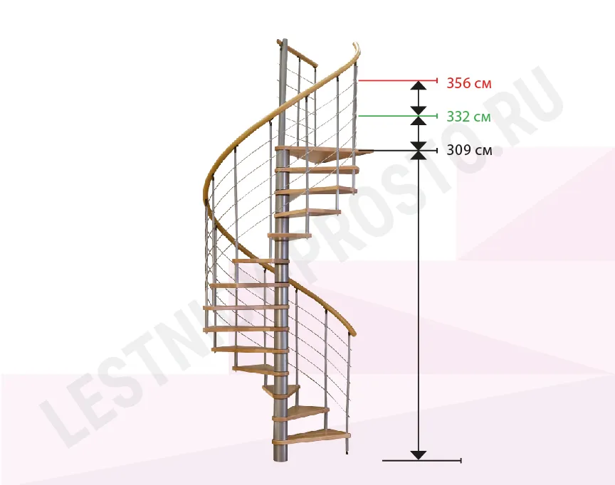 Благодаря возможности регулировать высоту шага с помощью пластиковых вставок (входят в базовый комплект), высоту лестницы можно варьировать в пределах от 2860 до 3090 мм. Кроме того, купив дополнительную секцию для этой лестницы, можно поднять высоту до 3320 мм. Ступени выполнены из сращенного дуба, покрыты износостойким твёрдым бесцветным лаком. Каркас серебристого цвета. Под заказ возможно изготовление лестницы другой расцветки.